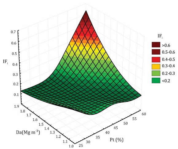 En lo que respecta a los horizontes (dos niveles), se evidencia la importancia de considerar la separación de los horizontes superficiales por sus límites naturales al momento de realizar el muestreo para determinar el IFi de los suelos, al igual que en el caso de la taxonomía, por lo que un tratamiento sin discriminación por este par de variables podría generar promedios que no representan ni al horizonte ni a la clase taxonómica considerada. De las covariables Da y Pt, la segunda resultó significativa, lo que sugiere que tiene una relación lineal con el índice de friabilidad y podría facilitar la predicción de la friabilidad en términos de esta covariable. Autores como Watts y Dexter (1998) y Munkholm et al. (2002a, b) han reportado una relación inversa entre friabilidad y Da, así mismo, Larionov et al. (2017), demostraron que la RR se incrementó en los suelos con mayores valores de Da; sin embargo, en este trabajo no se encontró un efecto significativo de esta variable física sobre el IFi, debido al bajo rango de variación de esta propiedad en los suelos estudiados (1,2 - 1,6 Mg m-3) o a las diferencias texturales. La Pt, en cambio, presentó un efecto altamente significativo (p<1%) en el índice de friabilidad (Tabla 2). Se encontró que, en general, hay un incremento de la friabilidad del suelo a mayor Pt, en especial, cuando esta presenta valores superiores al 45% (Figura 1). Estos resultados coinciden con lo reportado por Munkholm et al. (2001) y Munkholm et al. (2012), quienes encontraron correlación positiva y significativa entre la Pt y la friabilidad de suelos franco limosos y franco arenosos. Es de resaltar que cuando los suelos tienen valores superiores al 45% de Pt, prevalece el efecto de esta propiedad sobre los valores altos de Da y se corresponde con los mayores valores de IFi; sin embargo, a valores de Pt que están aproximadamente por debajo del 30% y de Da inferiores a 1,3 Mg m-3, prevalece la influencia de la densidad y se presenta un incremento del valor del IFi de los suelos. En los suelos con Pt superior al 35% y baja Da (aproximadamente < 1,3 Mg m-3), los valores del IFi se mantienen aproximadamente constantes. En general, los valores más altos del IFi se corresponden con los valores superiores al 45% del Pt (Figura 1).