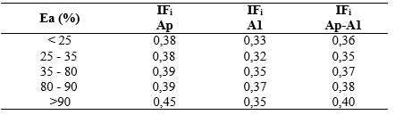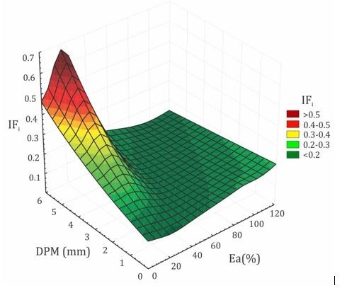 El análisis del comportamiento del IFi a partir de la interacción del DPM y el Ea de los suelos (Figura 2), muestra como en los valores bajos de DPM (<1,5mm), a medida que los suelos presentaron un mayor Ea, el IFi tiene una tendencia al incremento; sin embargo, en valores de Ea menores al 25% (muy bajos) el IFi se incrementó en la medida en que el DPM fue mayor. Cuando el Ea fue superior al 25% (bajos, medios y altos) el IFi mostró tendencia al decrecimiento con el incremento del DPM.