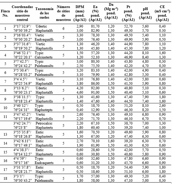 Los predios hacen parte del bosque seco tropical (IGAC, 1977) y de la unidad climática correspondiente al Tropical Lluvioso de Sabana (Awi) (clasificación climática de Köppen). Los suelos estudiados pertenecen a los órdenes Inceptisol, Vertisol, Molisol, Alfisol y Ultisol (USDA, 2010) y se localizan en los planos de terraza de la llanura aluvial del Río Cauca. Las principales propiedades y características físicas y químicas de estos suelos se encuentran en la Tabla 1.