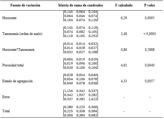 No se presentó interacción entre los factores de clasificación asociados al tipo de horizonte y la taxonomía de los suelos a nivel de orden (p=0,5888), tal como se observa en la Tabla 2, con lo cual se hicieron interpretables los efectos principales, a saber, la taxonomía y el horizonte, ambos con significancias inferiores al 1%, lo que condujo al rechazo de la hipotésis nula de efectos nulo en ambos casos. Esto sugiere diferencias altamente significativas en las respuestas (índices de friabilidad) como consecuencia probable del tipo de horizonte y la taxonomía considerada.