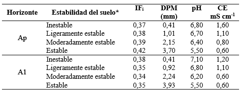 Tabla 3. Índice de friabilidad en su límite inferior (IFi), diámetro ponderado medio (DPM), pH y conductividad eléctrica (CE) con relación a la estabilidad de los suelos bajo estudio.