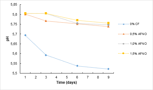 The pH of samples covered with AFNO had a significant decrease (p <0.05) during the days of storage 1, 3, 6, and 10, being more accentuated in the CF, as observed in Figure 1. This behavior may be caused by dissociations of organic acids, like lactic acid and acetic acid in the muscle tissue of the loins and to the loss of fluid from the meat tissue that causes increased concentration of the solutes and produces decreased pH (Wei et al., 2017).
