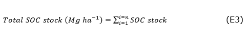 The determination of OC (g kg-1) was made by wet digestion with potassium dichromate (Walkley and Black, 1934). The amount of SOC stored was calculated (Equation 2), by multiplying by the Bd (mega grams-Mg m3), the depth (d) of soil sampling (0.10m), the OC between 1000 and by 10,000m2 factor corresponding to one hectare (Chen et al., 2019). Thus, Equation (3) provides the total SOC stock in the soil. The use of some correction factor for soil particles > 2mm, as suggested by Chen et al., (2019) and Reyna-Bowen et al. (2019), was ruled out because there was no stone in the sampled soils. The Bd and SOC determinations were performed at the soil laboratory of the Technical University of Machala.