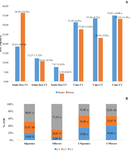 The comparison in percentages of the stored SOC (Figure 2B), indicated significance (p-value<0.05) in the land uses SIpasture, SIforest, and CNforest. In the SI soils, the first 10cm accumulated the highest percentage of SOC with 71.10%, in (SIforest) and 48.03% (SIpasture), while in CNpasture the percentages were 31.48, 33.48 and 35.06% for C1, C2 and C3 respectively. In CNforest, the percentage distribution of stored SOC was 32.93, 27.47, and 39.60% for C1, C2, and C3, in that order. These results are consistent with other research on high slope soils, where more than 60% of stored soc is located in the first 0,20m of the soil (Tonucci et al., 2017; Gebeyehu and Soromessa, 2018). The homogeneous distribution of the SOC in steeply sloping terrain is related to several factors such as the previous plant composition and the degree of profile formation, runoff, etc., while in flat areas the accumulation of OC is greater in the first 10cm as a result of the accumulation of biomass, which produces the formation of deeper humic horizons (Barré et al., 2017).