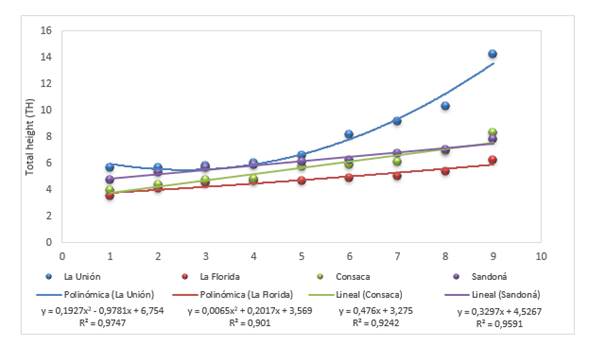 The data recorded for TH in the municipalities of La Unión and La Florida displayed a second-degree polynomial behavior, while TH in Consacá and Sandoná adjusted to a linear model (Figure 1). Furthermore, the predictive models for La Unión and La Florida vary according to the values obtained for the predictive variable, while in Consacá and Sandoná, these values are direct and constant.