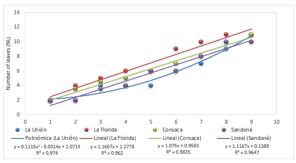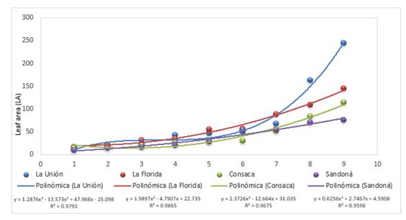 The highest mean value for LA was obtained in La Unión (244.05cm2), followed by La Florida (125.05cm2), Consacá (112.84cm2), and Sandoná (75.21cm2). However, the four municipalities showed an increase in LA over time that adjusted to a polynomial model (Figure 3). The model showed a good fit, indicated by an R2 greater than 0.95 for the four localities, which demonstrated the validity of the growth indices derived from the LA variable.