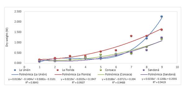 Regarding W, the seedlings from the municipality of La Unión reached a high mean dry weight (2.26g), followed by La Florida (1.61g), Sandoná (1.23g), and Consacá (1.18g). Seedling development was explained by a third-degree polynomial for La Unión and a second-degree polynomial for the other municipalities. R2 values ranging from 94 to 98% were obtained for the models (Figure 4). These results demonstrate the effect of temperature on the dry matter accumulation rate and growth of coffee seedlings (Cenicafé and Federación Nacional de Cafeteros de Colombia, 2013; Montoya et al., 2017; Gil, 2019).