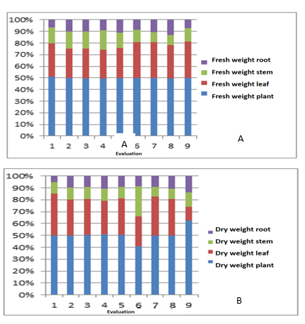 The dry weight of each plant part and its relationship with the total weight showed that 72.55% of the dry weight corresponded to the leaves (finding also observed for fresh weight), followed by the roots and stem (Figure 5B).