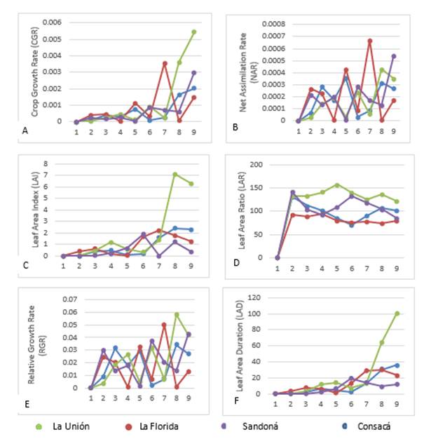 Figure 6. Growth indices of coffee seedlings in the municipalities of Consaca, Sandoná, La Unión, and La Florida: A) Relative Growth Rate, B) Net Assimilation Rate, C) Leaf Area Index, D) Leaf Area Ratio, E) Crop Growth Rate, and F) Leaf Area Duration.