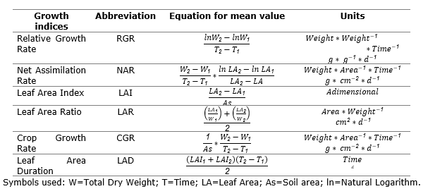 The variables measured were used to calculate indices such as the relative growth rate (RGR), leaf area index (LAI), net assimilation rate (NAR), crop growth rate (CGR), leaf area duration (LAD), and leaf area ratio (LAR), according to the equations shown in Table 2 (Gardner et al., 1985).