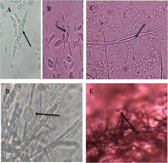 Figure 1 Morphological structures of Fusarium oxysporum. A. Septate macroconidia, with elongated and slightly curved apical and basal cells. B. Septate oval microconidia. C. Short monofialides. D. Smooth-walled chlamydiospores. E. Microconidia growing on false heads.