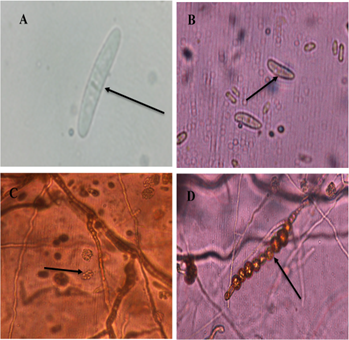 Figure 2 Morphological structures of Ilyonectria sp. A. Septate macroconidium. B. Oval microconidia. C. Microconidia growing on false heads. D. Globous, chain-like Chlamydiospores with thick walls.