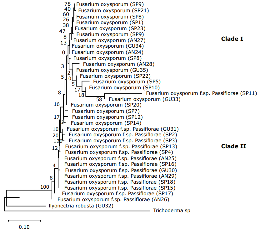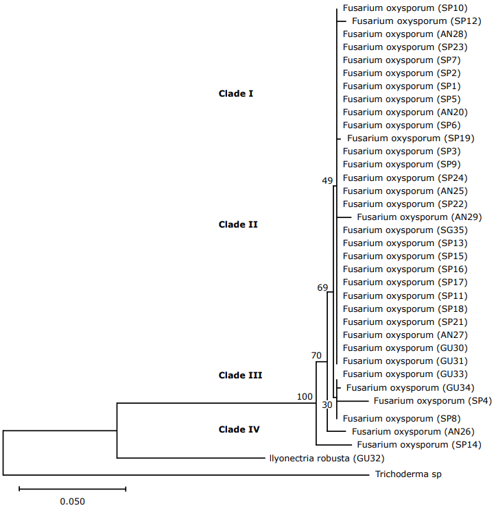 Most studies use the tef-1α gene to establish phylogenetic relationships within and between intraspecific groups (Nalim et al., 2009). In this case, it is observed that clade I isolate could be related to non-pathogenic Fusarium oxysporum, which would be verified in the next study through pathogenicity tests.