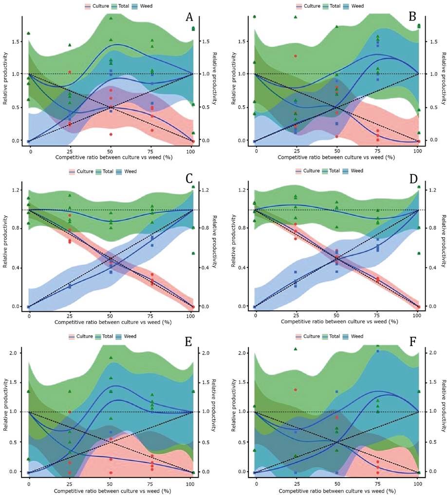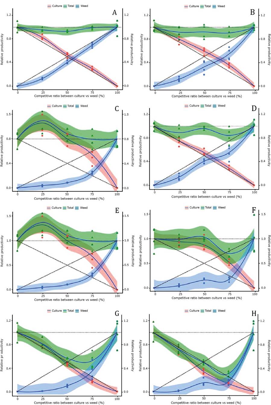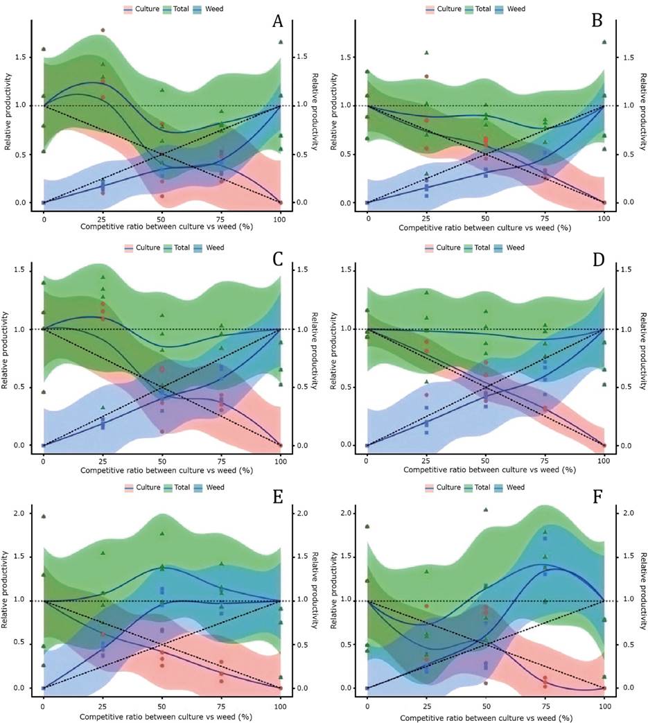 Species living in community may depend on the same resources available in the environment. Therefore, understanding the mechanisms involved in competition in replacement series allows the development of more efficient and sustainable weed management practices. Therefore, avoiding competition is a strategy that allows stronger growth of one species without harming the neighboring species, or even allows stronger growth of both species. Nevertheless, selecting a cultivar with higher competitive ability may have the greatest crop suppression potential against weeds (Frandoloso et al., 2019).