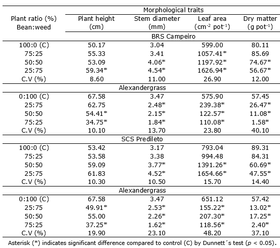 Table 3 Morphological traits of Phaseolus vulgaris, cultivars BRS Campeiro and SCS Predileto, grown with the weed alexandergrass in a replacement series arrangement, 55 days after plant emergence. UFFS, Erechim/RS.