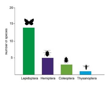 Among insects, the order Lepidoptera is of particular note (60%), with the greatest quantity of resistance information reported in the genus Helicoverpa spp. (formerly known as Heliothis), which is an important defoliator of cotton and corn crops. In the Coleoptera order (20%), certain pests of stored grains and seeds merit particular attention, while in the Hemiptera order (13%), whiteflies -insects associated with virus transmission - warrant further investigation. Finally, the order Thysanoptera reports one species (7%). Additionally, two species of the mite genus Tetranychus, which are known to be phytophagous pests, have been identified as resistant to acaricides in multiple crops (Figure 1).
