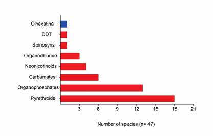 Figure 2 Number of species reported as resistant to each chemical group of insecticides/acaricides in Colombia. Blue: growth and development objectives; Red: nerve and muscle targets. (n=47).