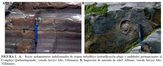 En las franjas separadas por las zonas de cizalla dúctil, las rocas del Complejo Quebradagrande se pueden ver sin deformación milonítica, con rocas sedimentarias con estructuras de estratificación plana y ondulada (FIGURA 2A). También es posible encontrar moldes de amonitas, de edad Albiano (FIGURA 2B). La deformación hallada en estas franjas corresponde a una serie de fallas inversas con buzamientos hacia el SE y vergencia hacia el SW.
