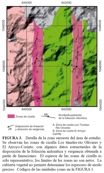 En el Metagabro del Río Olivares (Hincapié et al., 2010), el cual forma una faja continúa hacia el sur hasta el sector de Los Túneles, se presenta una serie de zonas de rocas milonitizadas, con espesores centimétricos, cuya tendencia estructural va desde N-S hasta NNE-SSW, con buzamientos altos al SE llegando a ser subverticales (FIGURA 4). Las rocas deformadas corresponden a protomilonitas y milonitas, las cuales tienen porfiroclastos de plagioclasa y piroxenos dentro de una constituida por minerales neoformados (clorita, actinolita y epidota).