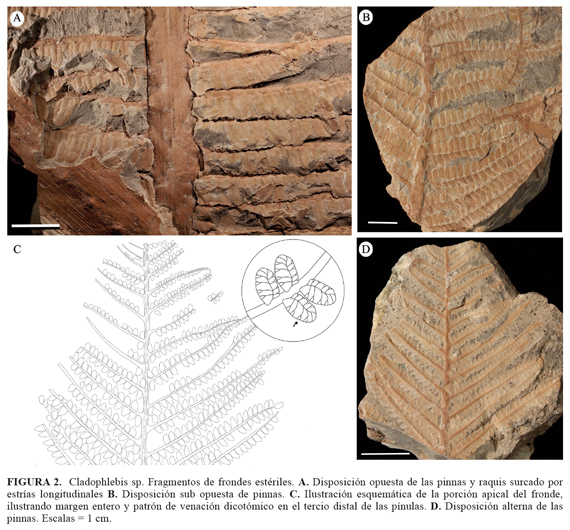 Descripción: fragmentos de frondes al menos bipinnadas, con medidas de 2,5-6 cm de largo (incompleto) y de 3-12 cm de ancho (FIGURAS 2A-D). Presenta un raquis recto en la mayoría de los casos, con medidas de 4-8 mm de ancho en la base y disminuye hacia el ápice, siendo surcado por finas estrías longitudinales (FIGURA 2A). La disposición de las pinnas es generalmente opuesta o sub-opuesta en la base del fronde y alternas hacia el ápice (FIGURAS 2A, 2D). Se insertan en ángulos de entre 60° y 90° aumentando hacia la base (FIGURA 2A). El ancho del raquis secundario (de 0,32 mm a 1,58 mm), decrece hacia el ápice. La distancia entre pinnas adyacentes es de 0,3 mm a 1 cm. Las pinnas adyacentes se encuentran levemente imbricadas hacia la porción basal del fronde (FIGURA 2A). Las pínulas tienen forma elíptica (distales) u ovada (proximales) y margen entero (FIGURA 2C). Se disponen de forma opuesta o sub-opuesta en la parte proximal de la pinna y alterna en la parte distal y se insertan perpendicularmente al raquis (FIGURA 2C).