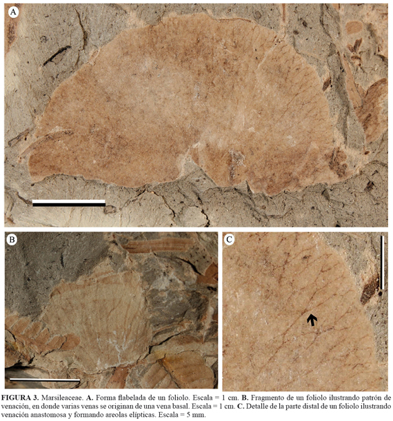 Marsilea johnhallii del Cretácico de USA fue descrito inicialmente por Skog and Dilcher (1992) para designar restos de foliolos de afinidad a Marsileaceae a partir al hallazgo de rizomas y peciolos con cuatro foliolos terminales de margen crenado a entero, venación dicotómica, formación de anastomosis, presencia de una vena marginal y sin estructuras fértiles en conexión orgánica. Posteriormente Nagalingum (2007), sugirió que restos vegetativos de tipo Marsileaceae que no han sido hallados en asociación repetida con esporocarpos deben ser incluidos en el morfogénero Marsileaceaephyllum (Hu et al., 2008; Taylor et al., 2009). Sin embargo Hermsen et al. (2014), proponen que muchos de los caracteres diagnósticos para asignar especímenes a Marsileaceaphyllum son muy amplios y se utilizan de manera ambigua, por lo que limitan la diagnosis para Marsileaceaephyllum únicamente a frondes estériles con cuatro foliolos de forma obovada a obdeltoide, y especímenes que sean hallados con menor número de foliolos y patrones de venación con poca preservación es recomendable designarlos como cf. Marsileaceae (Hermsen et al., 2014). Los patrones de venación observados en el nuevo material del VSM y en conjunto con comparaciones con otros foliolos de géneros referidos a Marsileaceae para el Cretácico (TABLA 2) permiten proponerlo como un representante fósil de esta familia en Colombia.