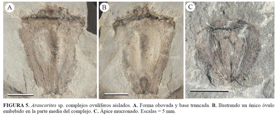 Discusión y comparaciones: el morfogénero Araucarites incluye complejos ovulíferos aislados de afinidad Araucariaceae (Zijlstra and Van Konijnenburg- Van Cittert, 2000; Rees and Cleal, 2004). Varios autores han propuesto incluir únicamente complejos aislados que no presenten lígula como Araucarites y dentro de Araucaria cuando la lígula es visible (Rees and Cleal, 2004). Sin embargo, la presencia o ausencia de lígula radica principalmente tanto de la cara (abaxial/adaxial) que se esté observando como de la preservación del espécimen (Rees and Cleal, 2004). En este trabajo se hace uso del nombre Araucarites como sugiere Rees and Cleal (2004) para designar únicamente complejos ovulíferos aislados de afinidad Araucariaceae y que no presentan una lígula visible.