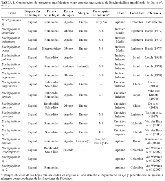 Brachyphyllum fue definido por Brongniart inicialmente en 1828, posteriormente Linder and Hutton (1836) describieron la especie tipo Brachyphyllum mamillare, haciendo énfasis en caracteres cuticulares de las estructuras vegetativas (Harris, 1979). Restos vegetativos de tipo Brachyphyllum han sido alternativamente relacionadas con varias familias de coníferas como Cupressaceae, Taxodiaceae (hoy Cupressaceae s.l), Podocarpaceae, Cheirolepidiaceae y Araucariaceae (Van der Hammen and Van Konijnenburg-Van Cittert, 2003; Du et al., 2013) siendo comúnmente asignado por varios autores a las dos últimas familias (Harris, 1979; Kunzmann et al., 2004). El material de Brachyphyllum sp. del VSM es comparado con varias especies mesozoicas a escala global (TABLA 3).