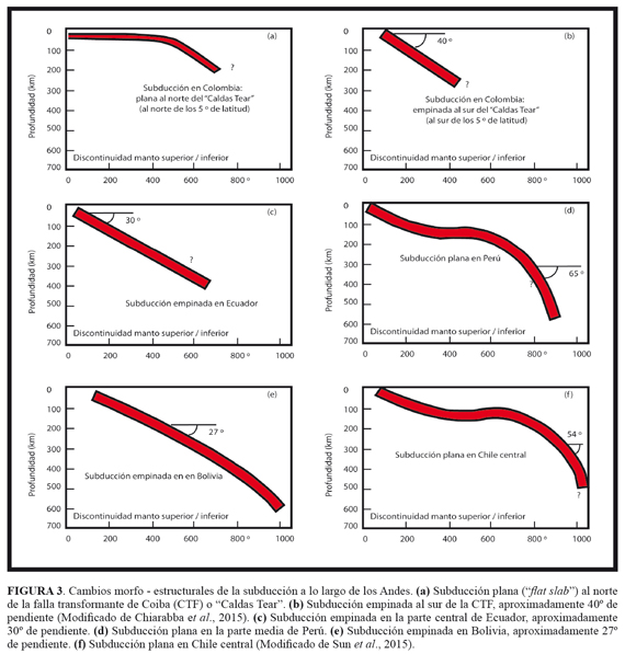 La subducción en Los Andes, en términos generales, presenta variaciones morfológicas de sur a norte, desde subducción plana en la parte central de Chile, Perú y el norte de Colombia ("flat slab"), hasta empinada en Bolivia, Ecuador y el sur de Colombia (Sun et al., 2015; Chiarabba et al., 2015) (FIGURA 3).