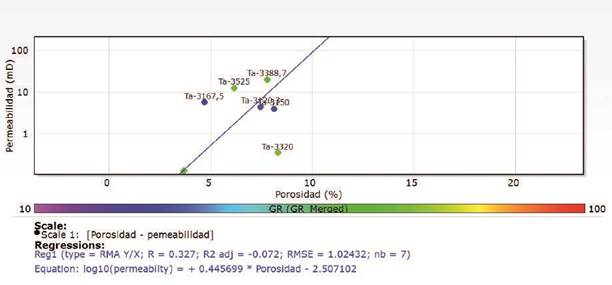 Figura 15 Gráfico cruzado de permeabilidad vs porosidad para el Ciclo 8. El color de cada punto representa su valor en el registro de gamma ray.
