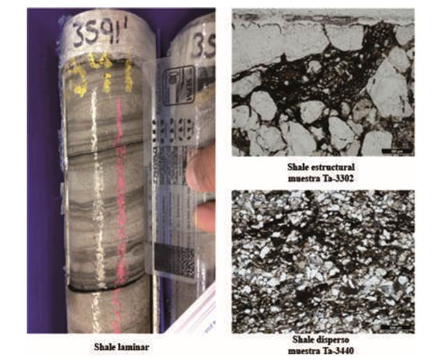 Figura 18 Distribuciones de shale encontradas en el Ciclo 8. Se observa la presencia de A. Shale laminar. B. Shale estructuralcomo clastos de lutita. C. Shale disperso representado como matriz arcillosa rellenando los espacios intersticiales de la roca.