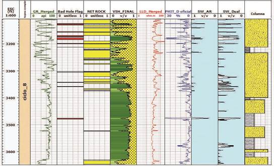 Posterior a esto, se determinaron los intervalos de Net Rock siguiendo la metodología de Cobb y Marek, (1998). Se calculó la porosidad para los niveles siliciclásticos utilizando el registro de densidad. Para el cálculo de saturación, primero se calculó el Factor de formación (F) utilizando la ecuación de Archie (Archie, 1941), se calculó la resistividad del agua (Rw) utilizando un pickett plot de resistividad vs porosidad como lo sugiere Pickett, (1973). También se calculó la saturación de agua utilizando el método de Doble Agua (DW) además de la ecuación de Archie. Antes de hacer los cálculos petrofísicos, se generó un fl ag de calidad del hueco para todos los ciclos de interés. El objetivo de generar un fl ag es determinar los intervalos en donde las condiciones del diametro del hueco no son buenas, es decir, zonas en donde pueden haber derrumbes de las paredes del pozo, por lo tanto las lecturas de las herramientas no son confi ables (especialmente las herramientas de densidad y neutrón). Los intervalos seleccionados usan el registro de CALIPER y DRHO_ Merged. Se utilizó un cutoff para el diametro del hueco entre 8,5 y 9,25 pulgadas y un cutoff para la correción de densidad (DRHO) de 0 y ±0,1 g/cc, estas herramientas van pegadas a las paredes del pozo, cuando existen derrumbes ellas quedan lejos de la pared del pozo y por eso se producen las lecturas erróneas (Schlumberger, 1996), por tal motivo se descartaron las lecturas que no pertenecieran a los rangos mencionados.