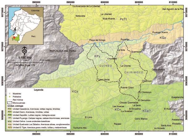 El área de estudio forma parte de la cuenca AlamorLancones (Eguez y Poma, 2001) ubicada entre el Bloque Amotape-Tahuín de edad Paleozoica al oeste y al arco volcánico continental Celica al este (Jaillard et al., 1996). Esta cuenca es de origen marino, de edad Cretácico superior, compuesta de una secuencia turbidítica, cuyos sedimentos siliciclásticos provienen del oeste y los sedimentos vulcanoclásticos provienen del este (Jaillard et al., 1999). Las microcuencas Chirimoyo y Guineo (ver Figura 1) se ubican geológicamente en las formaciones sedimentarias del Cretácico medio, Ciano, Zapotillo y Cazaderos, inicialmente identificadas como del grupo Alamor (Kennerley, 1973). Estudios posteriores a detalle en la Formación Cazaderos diferenciaron secuencias de diversos ambientes sedimentarios, identificadas informalmente como formaciones Bosque de Piedra y Puyango (Jaillard et al., 1999). En la actualidad se identifican de acuerdo al sitio aflorante como Unidad Quebrada Los Zábalos y Unidad Puyango, manteniendo las formaciones Zapotillo y Ciano identificadas en primera instancia (INIGEMM, 2013).