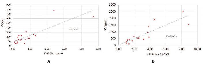 En los diagramas de dispersión (ver Figuras 4A y 4B) de Ca-V en ambas microcuencas, se evidencia la correlación positiva entre calcio y vanadio, lo cual sugiere que entre los fragmentos líticos se encuentran detritos de calizas y/o lutitas calcáreas negras, las cuales como se indicó anteriormente al contener materia orgánica, pueden albergar metales enlazados o absorbidos en su superficie.