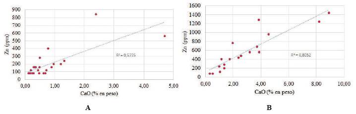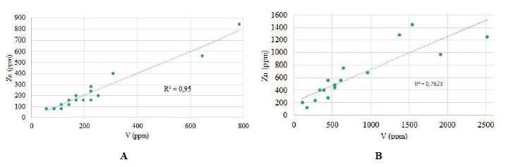 De igual manera existe correlación positiva entre calcio y zinc (ver Figuras 5A y 5B), por lo que se puede asumir una procedencia similar de fragmentos de calizas negras o lutitas calcáreas negras, debido a su contenido de materia orgánica se pueden asociar estos metales. La correlación positiva alta entre V-Zn (ver Figuras 6A y 6B) demuestra un origen común para estos metales.