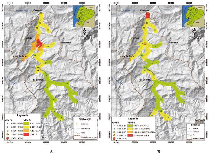 Existen valores anómalos de calcio y fósforo en ambas microcuencas en la zona norte, lo que corresponde a la Formación Puyango, por lo que existen indicadores geoquímicos de que las rocas fuentes en esta zona son calcáreas y contienen fosfatos.
