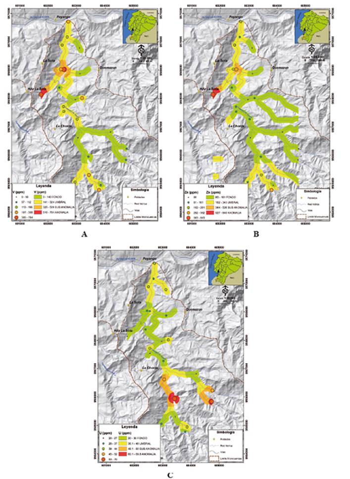 Los sedimentos con concentraciones más elevadas de V, U y Zn, provienen de las rocas de la Formación Puyango principalmente, la cual esta compuesta de calizas negras, calizas bituminosas y lutitas calcáreas de origen marino. Estas rocas al contener materia orgánica pueden estar albergando una mineralización de estos elementos, debido a que pueden ser trampas geoquímicas de los elementos redox sensibles antes mencionados, corroborando las anomalías radiométricas analizadas en el sector en los años 70´s y 80´s.