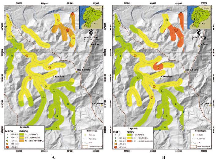 Basados en los cálculos geoestadísticos de fondo, umbral, subanomalías y anomalías, se construyeron mapas geoquímicos de ambas microcuencas, con el fin de delimitar las áreas más favorables para la prospección de elementos químicos de interés económico (ver Figuras 7, 8, 9 y 10). Según los mapas geoquímicos mostrados anteriormente, las mayores concentraciones tanto de Ca como de P provienen de la zona norte de la subcuenca Chirimoyo, por lo que se deduce que las rocas fuentes en este sector son calcáreas y con presencia de fosfatos.
