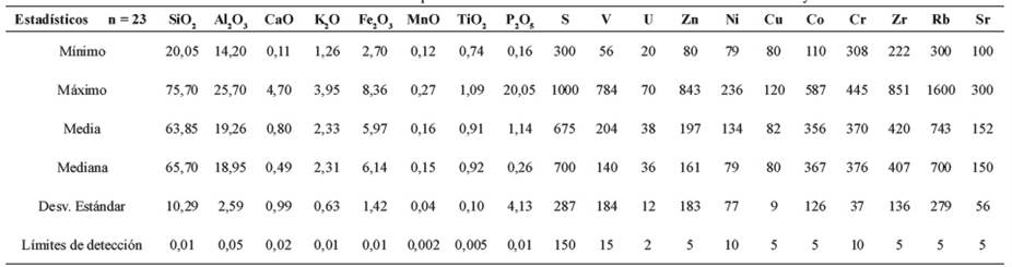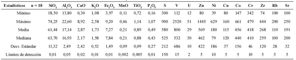 Elementos mayoritarios y minoritarios (%) (Si, Al, Ca, K, Fe, Mn, Ti, P). Elementos trazas (ppm) (S, V, U, Zn, Ni, Cu, Co, Cr, Zr, Rb, Sr)