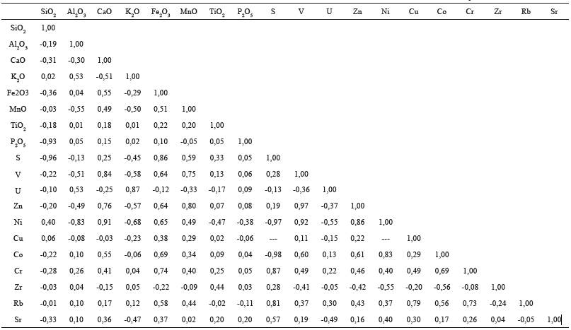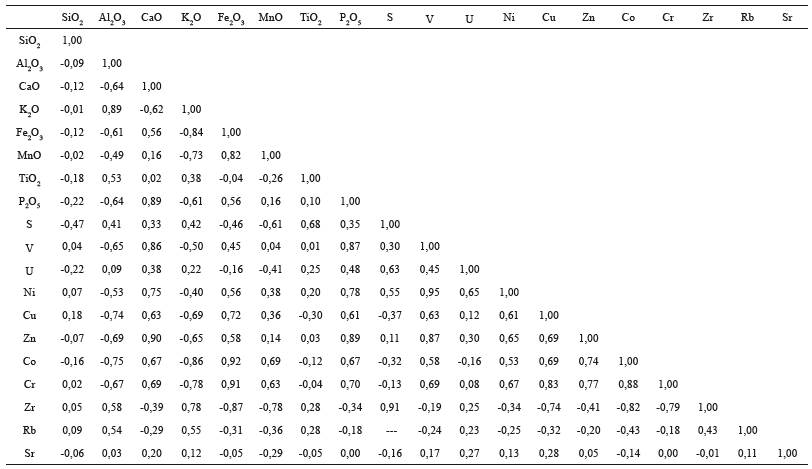 Se determinó el coeficiente de correlación para los datos químicos de los sedimentos (ver Tablas 5 y 6). En ambos casos se observa la correlación fuerte positiva entre Ca-V (0,84 y 0,86), Ca-Zn (0,76 y 0,90), V-Ni (0,92 y 0,95) y V-Zn (0,97 y 0,87), esto se puede deber a que existan fragmentos de calizas que contengan estos metales (V, Ni y Zn), minerales como la sincosita que contiene Ca y V, por otro lado es probable que se encuentren asociados a la materia orgánica que contienen las calizas y lutitas negras de la Formación Ciano y Formación Puyango, ya que el V por ejemplo puede formar complejos organometálicos como las porfirinas (Gao et al., 2013), los cuales se encuentran en la materia orgánica de origen marino (Huang et al., 2015).