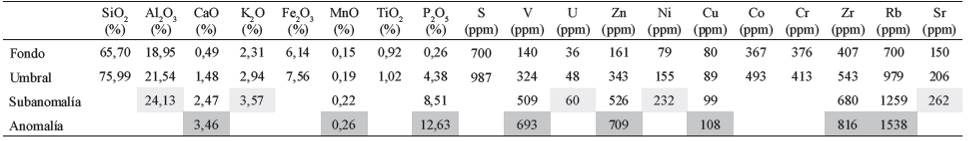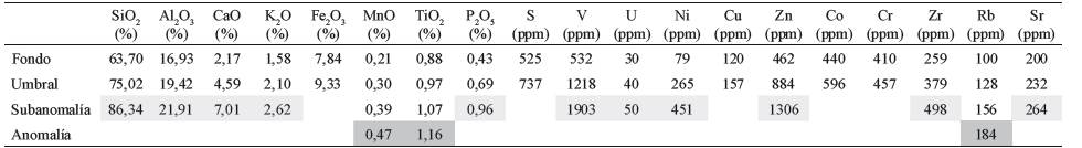 En las Tablas 3 y 4, se muestran los valores mínimo, máximo, promedio, mediana y desviación estándar de elementos mayoritarios, minoritarios y trazas determinados mediante el análisis químico a las muestras de ambas microcuencas. Estos datos fueron utilizados para calcular los valores de fondo, umbral, subanomalía y anomalía de los elementos químicos analizados.