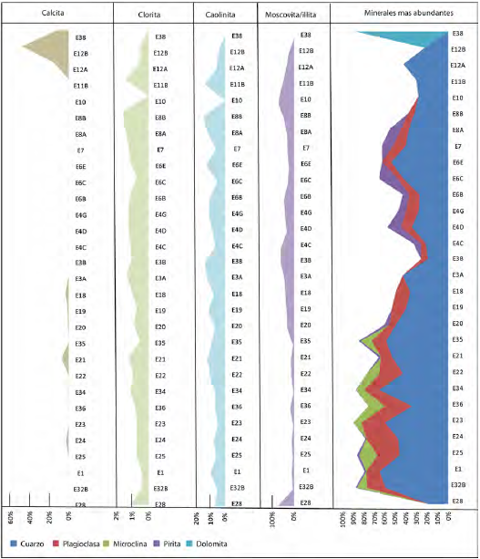 Las limolitas tienen una menor proporción de cuarzo y plagioclasa además de ausencia de feldespatos alcalinos respecto a las arenitas, en cambio el porcentaje de moscovita/illita aumenta considerablemente. La muestra E38 es una roca calcárea y está compuesta por 11,6 % de calcita y 88,4% de dolomita.