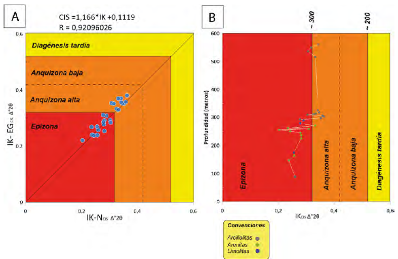 Como se puede apreciar en la Figura 8A el valor del coeficiente de correlación es del 92% por lo tanto los datos se consideraron fiables, denotando también que había ausencia de minerales arcillosos expansivos. Teniendo en cuenta lo anterior, se determinaron los índices de cristalinidad con los que se estimó la temperatura a la que se sometieron las rocas. Los valores de índice de Kübler (IK) que limitan la anquizona son 0,32 y 0,52 Δ°2θ. El intervalo de temperatura que corresponde a la anquizona se encuentra entre los~200 a ~300°C, y la división entre la anquizona baja y anquizona alta se estableció en 0,42 Δ°2θ (Warr y Ferrero-Mählmann, 2015). La epizona corresponde a temperaturas superiores a los 300°C (Figura 8B).