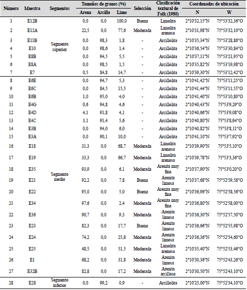 Tabla 1. Clasificaciones texturales según Folk (1980) para las muestras analizadas con base en los diagramas ternarios de la Figuras 3A y 3B.