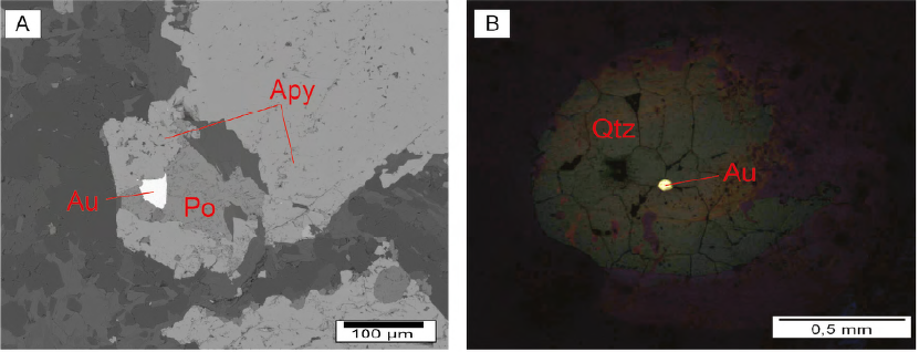 Figura 5. Fotomicrografía de láminas delgadas pulidas del BIF y venas de cuarzo: A. Oro (Au) asociado a la arsenopirita (Apy) y pirrotita (Po) (microsonda electrónica) (muestra PL4A). B. Oro libre en venas de cuarzo (luz reflejada) (muestra PL14D).