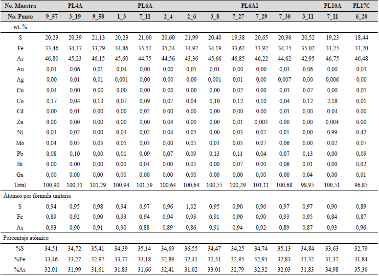 Para determinar con precisión la composición de la arsenopirita, se consideraron los resultados obtenidos por Kretschmar y Scott (1976), donde se reportan algunos estándares mínimos para realizar análisis en microsonda electrónica. En este trabajo se consideran los diferentes productos de reacción, la naturaleza de los cristales y las texturas de intercrecimiento. Muchas de estas reacciones generan productos con porosidad (agregados multicristales mezclados con fluidos enriquecidos con S – As), por lo cual se consideran los siguientes criterios: i) los análisis deben realizarse principalmente en cristales bien formados y, de no ser posible, estos deben sumar entre 98 y 101% peso (wt.%); ii) cada análisis debe constar con un tiempo de conteo mínimo de 10 s; iii) el % atómico (at.%) de Fe indica la calidad de los análisis, este puede variar entre 30,3 a 35,5 at.%, dependiendo de la relación S/As de la arsenopirita.