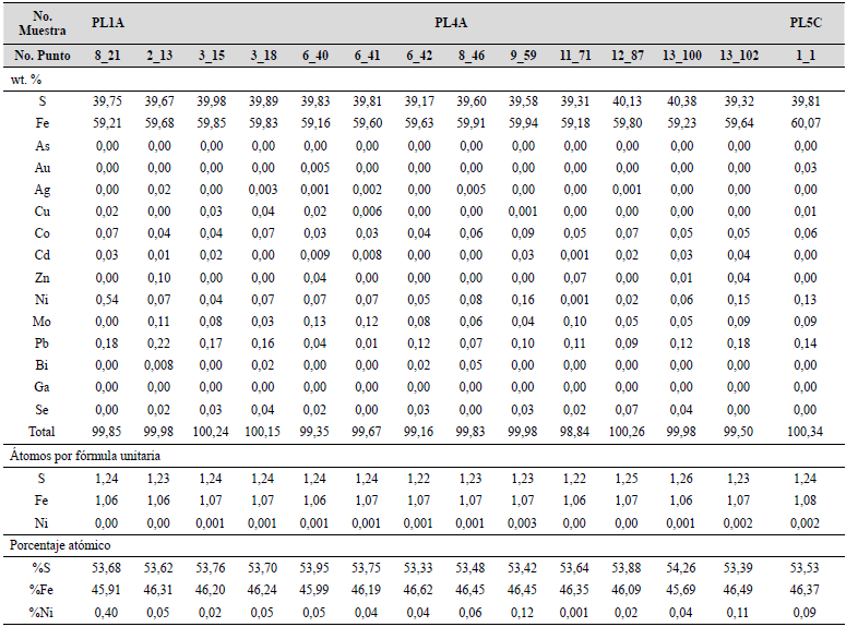 La pirrotita (Fe1-xS) posee X variando entre 0 y 0,08 y contenido en Fe ≈59,14 wt. % y S≈38,93 wt. %, con pequeñas cantidades de Ni entre 0,02 hasta 0,65 wt. %, Co entre 0,03 hasta 0,11 wt. % (Tabla 2). Los valores de la media para Au y Ag son menores que 0,01 wt. %.