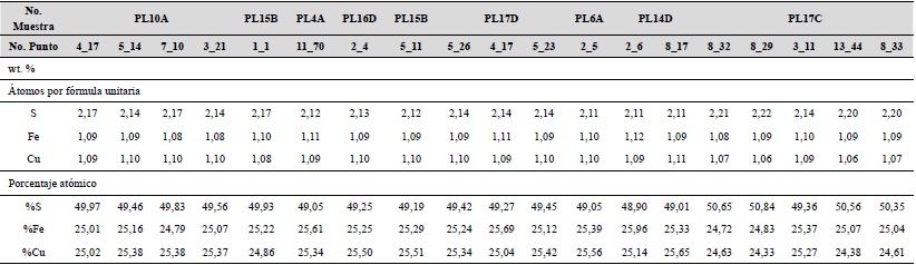 Tabla 4. Resultados de química mineral para calcopirita (wt. %), recalculados en átomos por fórmula unitaria (afu) y porcentaje atómico (at. %).