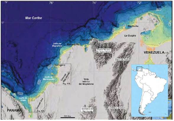 Figura 1 Localización regional del Margen Caribeño Colombiano. Los recuadros indican la localización de las Figuras 11A y 11B (tomada de https://maps.ngdc.noaa.gov/viewers/bathymetry/).