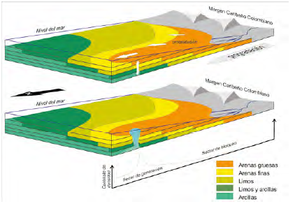 Como consecuencia del bloqueo del río Cauca, se produce una notable disminución de la tasa de sedimentación de las secuencias Plio-pleistocenas en el sector austral del MCC y, contrariamente, un fuerte incremento en el norte que fortalece la conformación del enorme abanico submarino del Magdalena. Debido al mayor desplazamiento oriental acumulado de la placa Caribe sobre la cual se apoya la desembocadura del río Magdalena, las secuencias infrayacentes de su delta se trasladan progresivamente hacia esa dirección (Figura 4C).