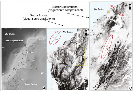 Figura 11 A. Distribución del diapirismo argilocinético sobre el MCC donde se expresan los diferentes tipos morfológicos de plegamientos asociados con el diapirismo. B. DEM del sector austral con pliegues gravitatorios, sinclinales muy extendidos y charnelas anticlinales apretadas (1: eje plegamiento; 2: ancho plegamiento). El rectángulo amarillo indica la localización de la Figura 16. C. DEM del sector septentrional con pliegues en échelon, con dobles buzamientos más apretados y con ejes más elongados. La estrella amarilla indica la localización del volcán Totumo, y la línea roja NO-SE indica la localización de la línea sísmica de la Figura 13.